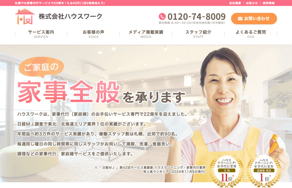 家事代行専門サービスとして22周年を迎えたハウスワークは、日経MJ調査で東北・北海道エリア第1位を獲得。札幌・近郊で約90名のスタッフが在籍し、年間延べ3万件以上の実績を誇ります。